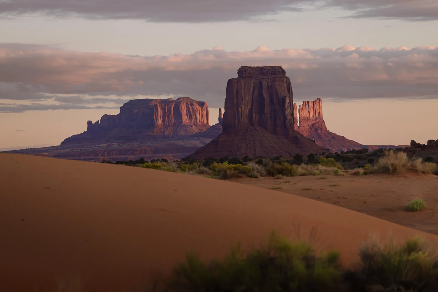 The three most striking features are the East and West Mittens and Merrick Butte. Together they create one of the iconic images of Monument Valley.